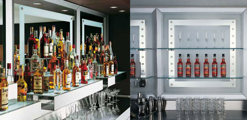 REFLEX police od pocinčanog lima sa pozadinskim osvjetljenjem, opremljene visokoučinkovitim fluorescentnim svjetiljkama. Stepenasti sistem polica napravljen je od nehrđajućeg čelika u tri nivoa, sa policama u staklu i fluorescentnim rasvjetnim sustavom. Pozadina nadgrađa retropulta na poziciji gdje bi trebao biti smješten aparat za kavu, presvučen je inoxom AISI 304. U ponudi se nalazi i oprema za izlaganje duhanskih proizvoda s pozadinskim osvijetljenjem: police pod nagibom napravljene od pleksiglasa, s pregradama od nehrđajućeg čelika i potisnim valjcima.