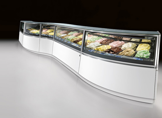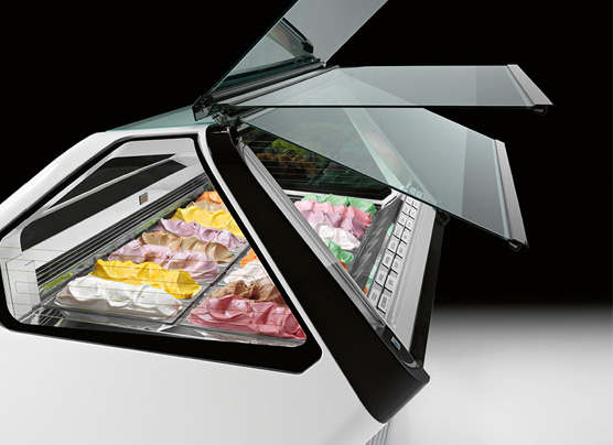 - Za razliku od normalnog pozzetti pulta, sladoled se sada može vidjeti, zahvaljujući vratima od kaljenog i grijanog pirolitičkog stakla (za 2 ili 4 otvora) koja služe kao zaštitna barijera između kupca i sladoleda kada su otvorena. LED rasvjeta perimetar naglašava prirodne boje sladoleda.
